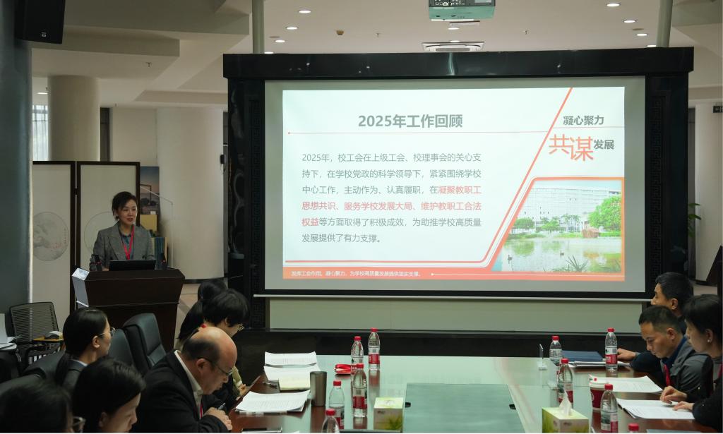 工会主席赵丽同志以《履职尽责勇担当凝心聚力谱新篇以实干实绩助推学校跨越式发展》为题向与会代表汇报工会2025年工作情况及2026年工作思路。